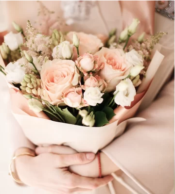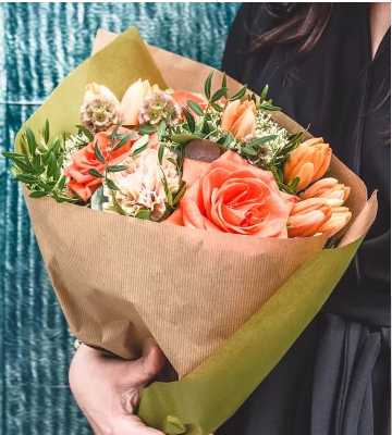 Мы перевяжем букет атласными лентами, упакуем в красивую бумагу и приложим карточку от вашего имени.